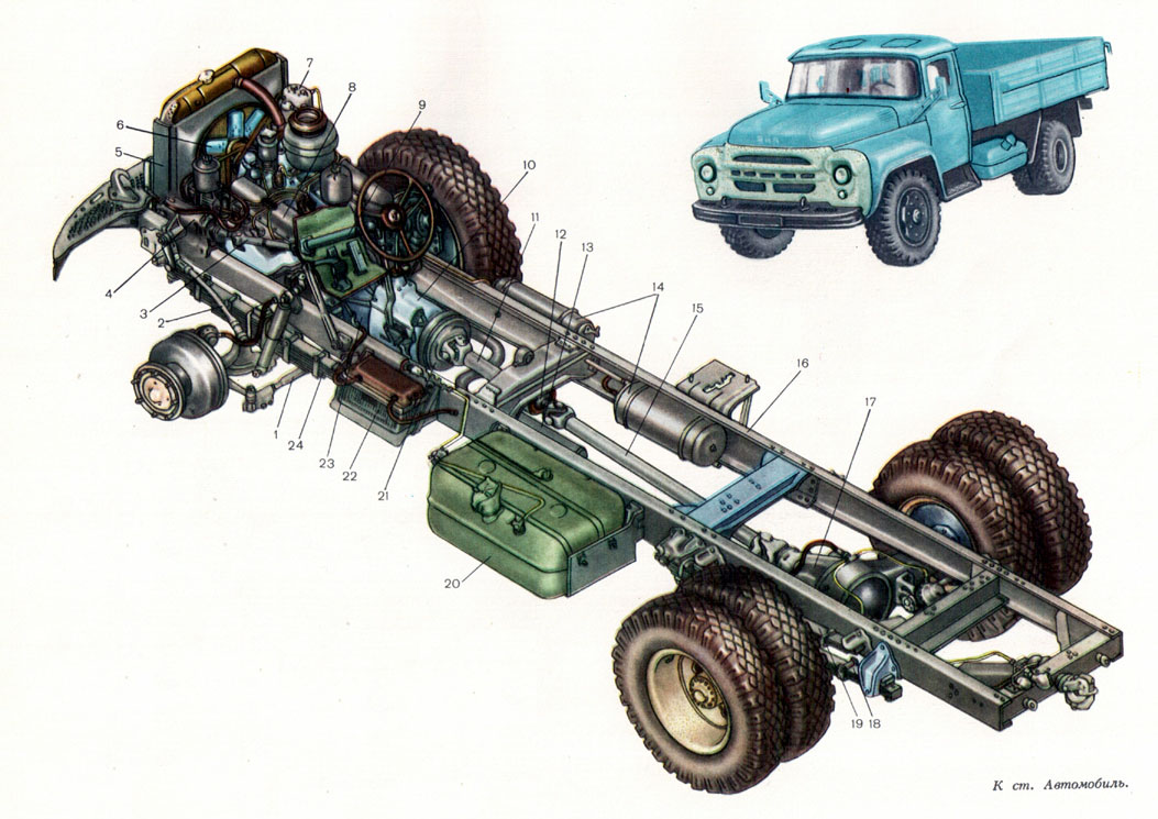 Грузовой автомобиль ЗИЛ-130: 1 - поперечная рулевая тяга; 2 - продольная рулевая тяга; 3 - вал карданной передачи рулевого управления; 4 - рулевой механизм и гидроусилитель; 5 - радиатор системы охлаждения; 6 - вентилятор системы охлаждения; 7 - компрессор пневматического привода тормозов; 8 - двигатель с оборудованием; 9 - рулевая колонка; 10 - коробка передач; 11 - промежуточный карданный вал; 12 - промежуточная опора; 13 - глушитель; 14 - воздушные баллоны пневматического привода тормозов; 15 - основной карданный вал; 16 - рама автомобиля; 17 - задний мост; 18 - задняя рессора; 19 - дополнительная рессора; 20 - топливный бак; 21 - барабан ручного тормоза; 22 - аккумуляторная батарея; 23 - сцепление; 24 - передняя рессора.